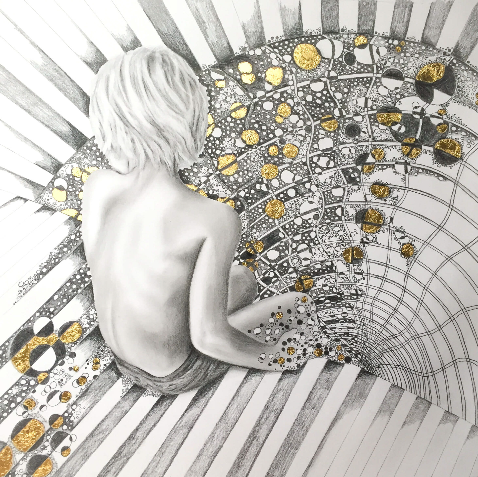 Tittel: "Mot". Teknikk: Blyant, slagmetall. Mål med ramme: Originaltegning ca. 90 cm x 90 cm. Print ca. 60 cm x 60 cm