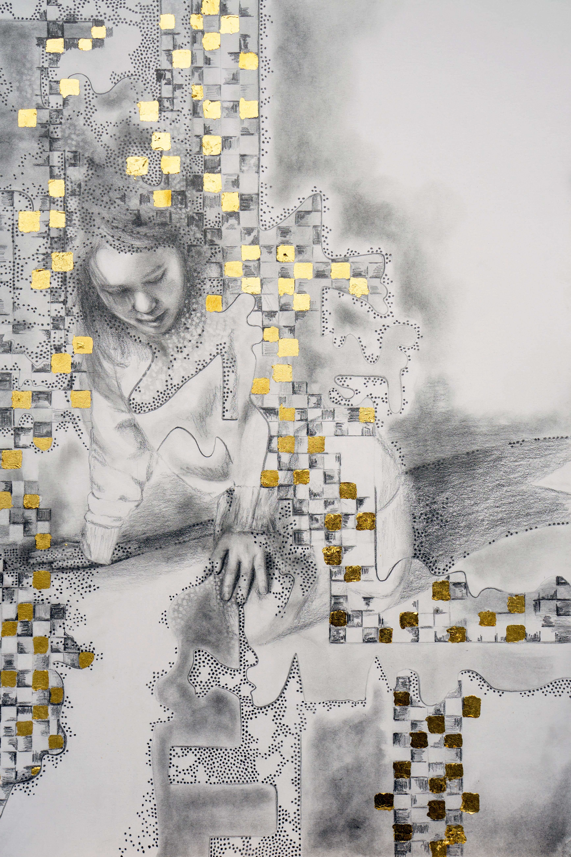 Tittel: "glitch". Teknikk: Blyant, kull, bladmetall. Mål med ramme: Originaltegning ca 00 cm x 00 cm. Print ca 00 cm x 00 cm.