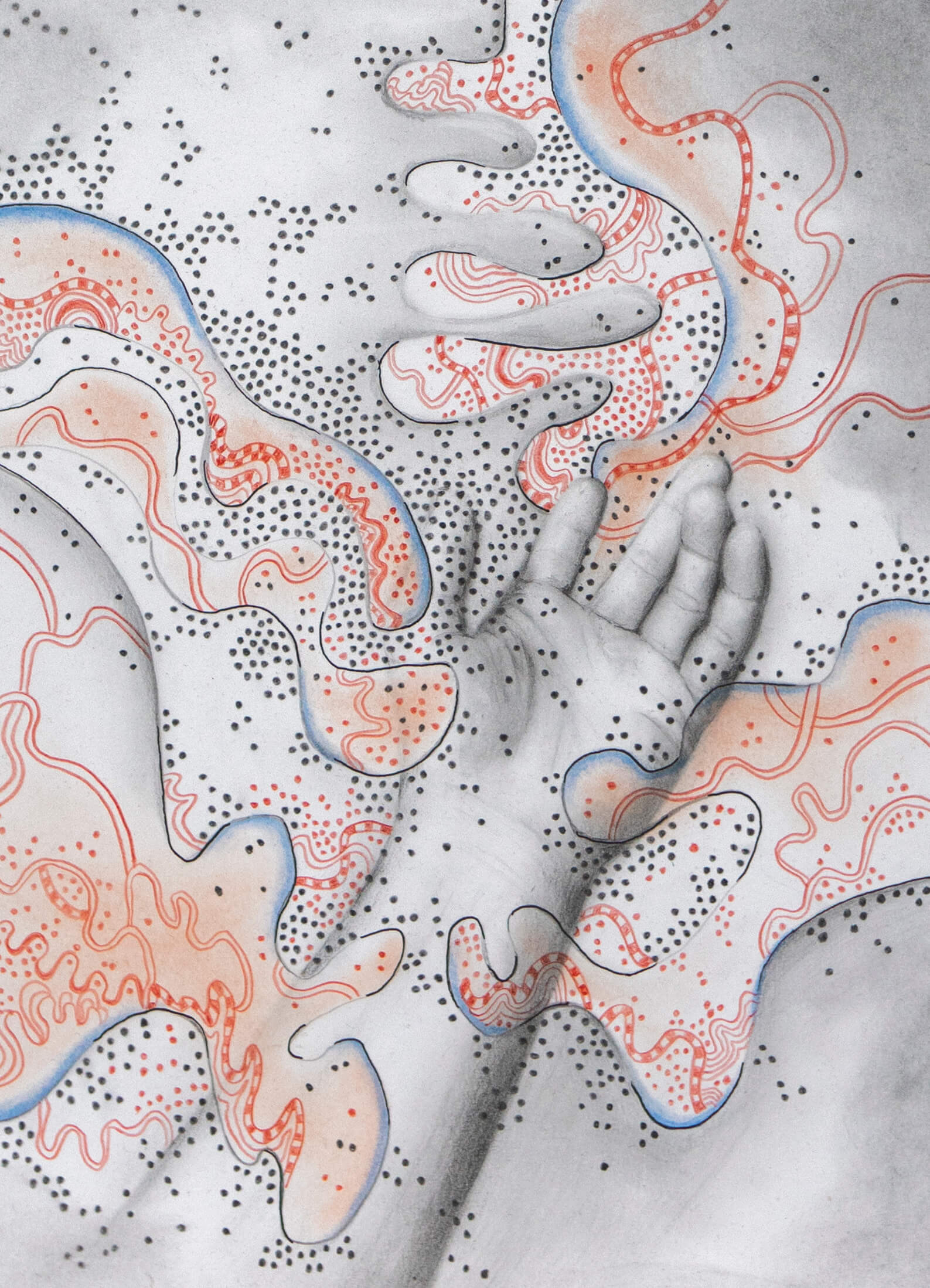Tittel: "Venstrehåndsarbeid". Teknikk: Blyant, kull, kritt. Mål med ramme: Originaltegning ca 00 cm x 00 cm. Print ca 00 cm x 00 cM